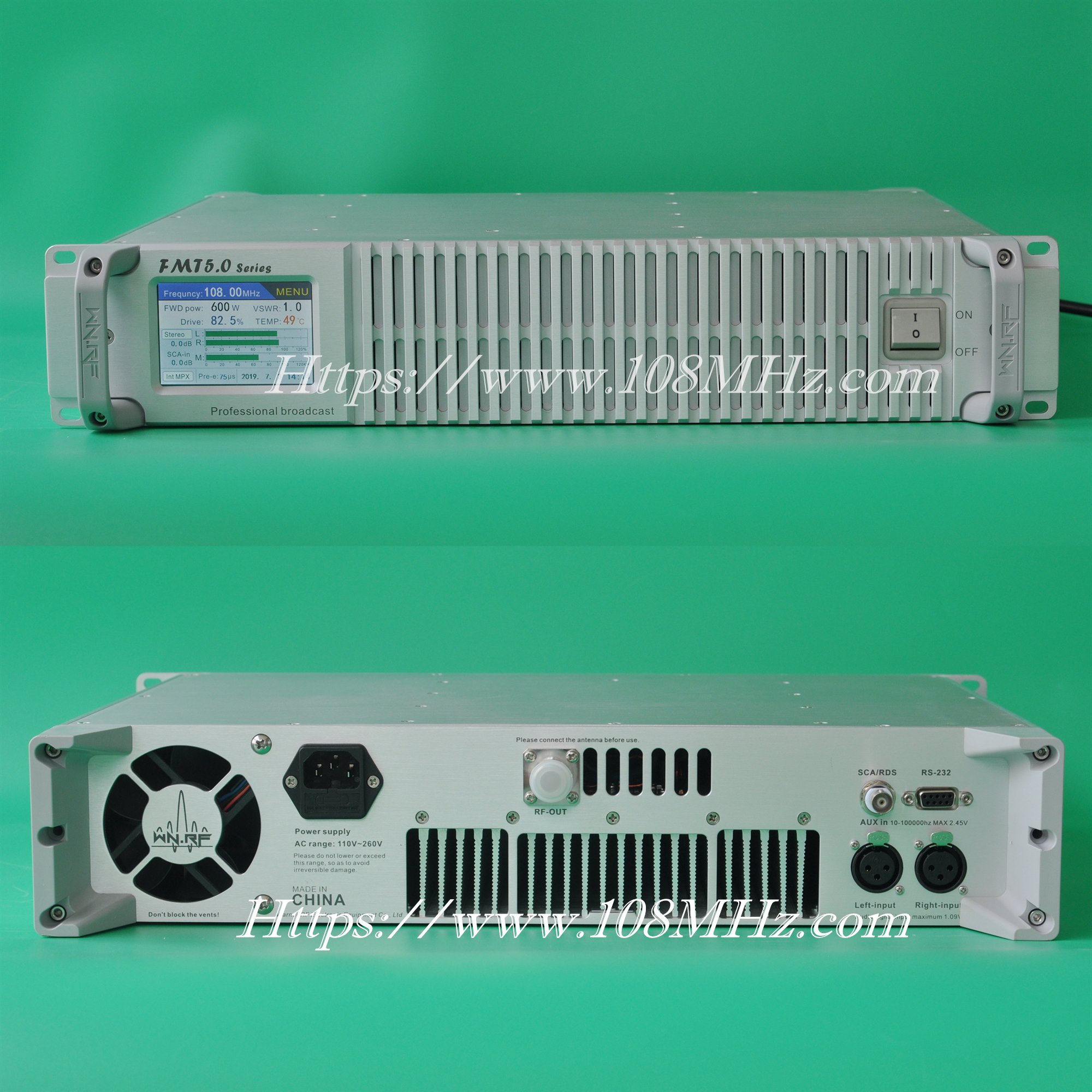 - Convenient System Monitoring – The display shows all key operating parameters, including frequency,stereo/mono mode, volume, amplifier MOSFET temperature, audio VU meter,forward/reflected power, modulation mode and pre‑emphasis status.